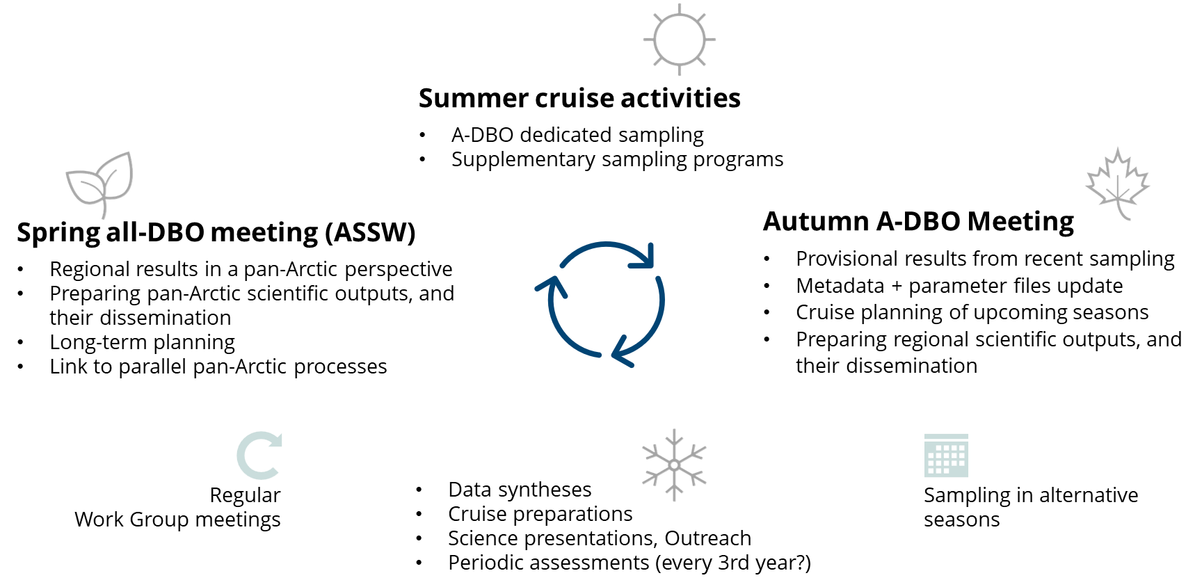 The annual cycle of the A-DBO activities with the main networking events being the open community meetings in autumn,