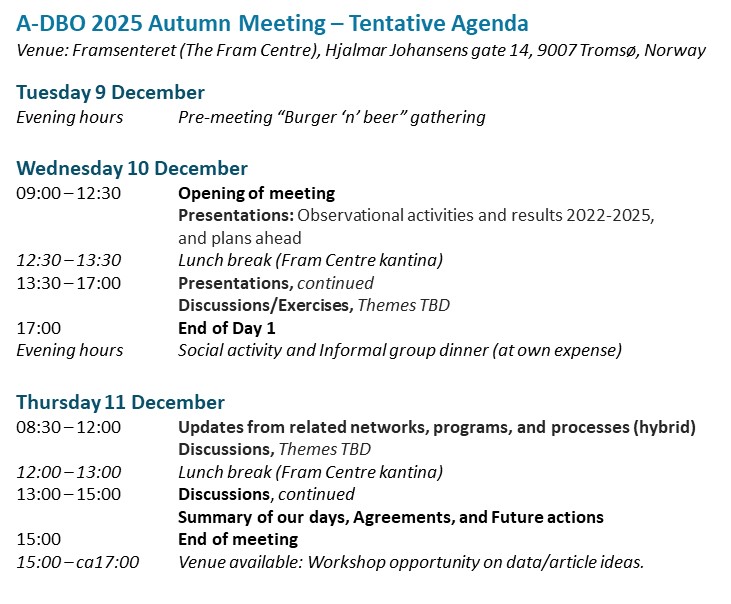 📢 Our next A-DBO fall meeting will take place 10-11 December 2025 in Tromsø, Norway! We work to boost collaboration within the Atlantic-Arctic domain, across biological, chemical, physical marine observing or modelling efforts. The 2-day program is built around your presentations and interests, so please share such with us as soon as possible (deadline for registration of talks is 31 October). More info and link to the registration form further down, under 'Upcoming events'.