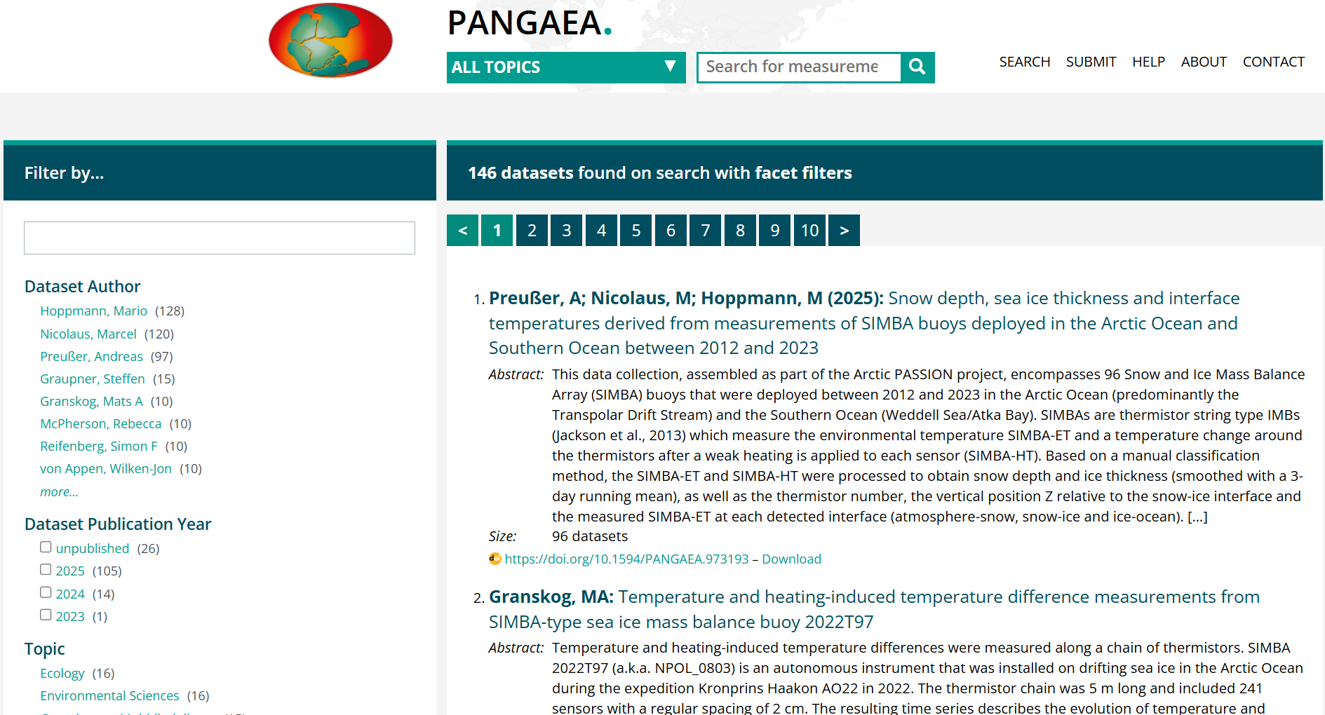 PANGAEA is an Open Access library aimed at archiving, publishing and distributing georeferenced data from earth system research. PANGAEA guarantees long-term availability (greater than 10 years) of its content. PANGAEA is open to any project, institution, or individual scientist to use or to archive and publish data. PANGAEA focuses on georeferenced observational and experimental data. Citability, comprehensive metadata descriptions, interoperability of data and metadata, a high degree of structural and semantic harmonization of the data inventory as well as the commitment of the hosting institutions to ensure FAIRness of archived data. PANGAEA contains 119 records of Arctic PASSION data as of December 2nd 2025.