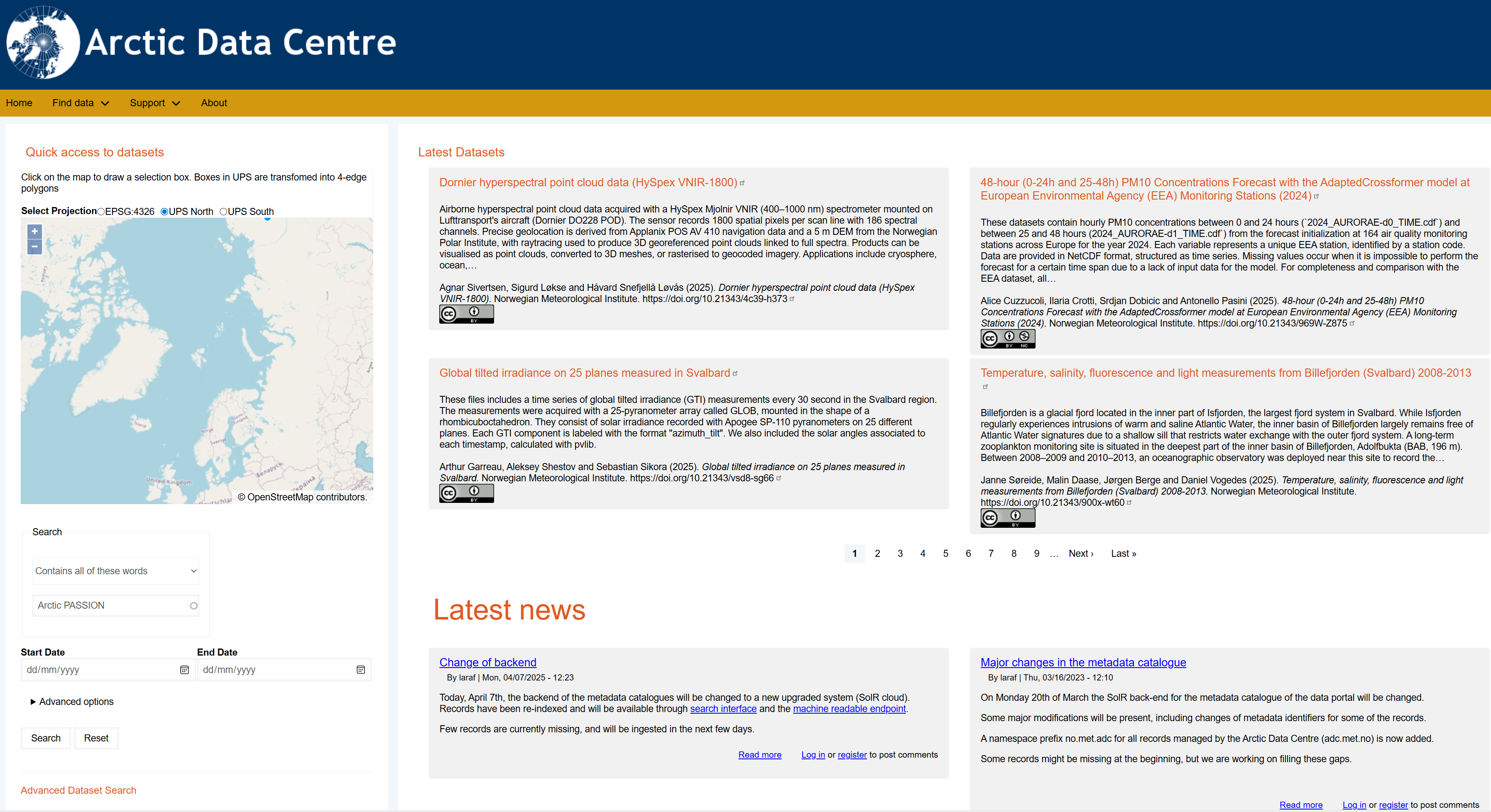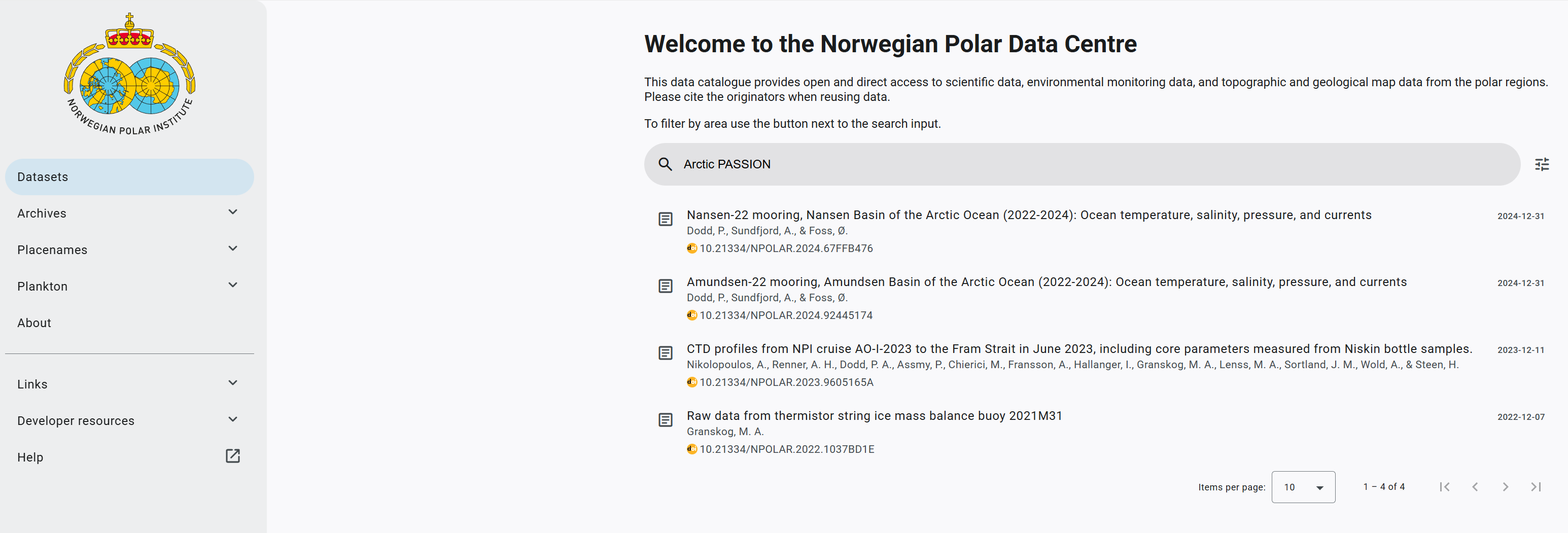 The Norwegian Polar Data Centre catalogue provides open and direct access to scientific data, environmental monitoring data, and topographic and geological map data from the polar regions, and contains three Arctic PASSION datasets as of December 2nd 2025.