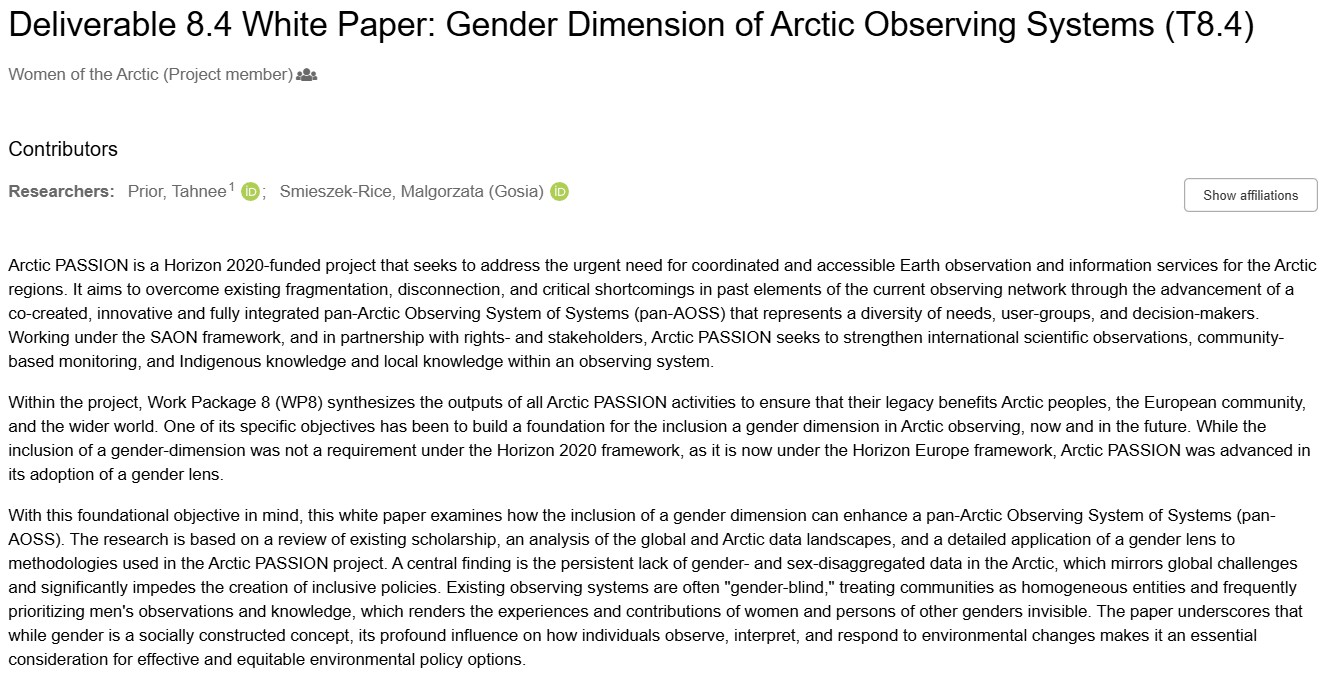 - Advance the gender dimension of an Arctic Observing System This will be led by Partner WoA and the objective is to better respond to the full diversity of data providers and user-needs, and how these can be taken up in the design, implementation, and the use of the pan-AOSS, its tailored products and services.