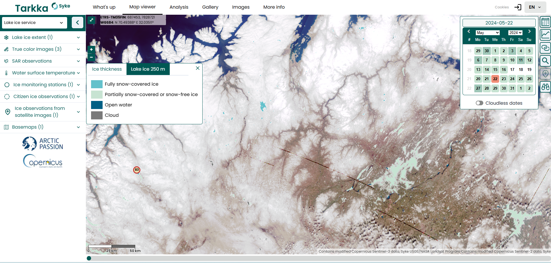 The Lake Ice Service for Arctic Climate and Safety is integrated into the Finnish Environment Institute’s Earth Observation service. It provides near real-time information on the ice conditions of freshwater lakes by combining satellite data — such as lake ice and water temperature products, radar and true color images — with in-situ observations from communities and authorities. This service is ideal for visualizing spatiotemporal data in map format or as statistical time series.